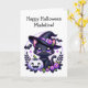 Eine hübsche Halloween-Karte für Kinder, die Sie persönlich gestalten können! Fügen Sie den Namen des Kindes in den personalisierenden Bereich ein. Hier finden Sie einen niedlichen Kawaii-Chibi-Kürbis, eine Katze und Blume in lila, weiß und schwarz. Die Innenseite ist eine Farbseite.