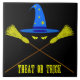 Zeichnend von einem blauen Zauberhut, der mit gelben Sternen und zwei gekreuzten Hexenbesen unter dem Hut dekoriert ist. Dämonisch gelbe Augen zwischen Hut und Besen und eine Text-Leckerei oder Trick. Ein lustiges Halloween-Thema. Essen, trinken und beängstigend sein. Produkte und Souvenirs im quadratischen Format.