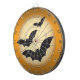 Dieses Dartboard hat einen dunkelorangen Hintergrund, der Mond in der Mitte und drei Fledermäuse fliegen vor dem Mond.