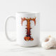 This is a festive, spooky illustration featuring an ornate, glowing orange letter 'T' that looks like an ancient, horned pillar, decorated with autumn leaves and vines. It is centered above two glowing, grinning jack-o'-lanterns nestled in a pile of fallen leaves against a dark, hazy teal background.