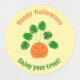 Dieses phantastische Set von Halloween-Party-Gefallen-Labels zeigt ein digitales Kunstbild einer Serie von Blätter aus einer Hauspflanze namens Monstera, auch bekannt als Schweizer Käse-Pflanze. Die Blätter sind dunkelgrün und haben eine Lobby und einige haben Löcher in ihnen. Die Pflanze ist in einem beängstigend orangefarbenen Halloweenkürbis mit einem bösen Grinsen, scharfen Zähnen und bösen Augen untergebracht. Es gibt einen eigenen Text, damit Sie dieses Design mit Ihrer eigenen Nachricht personalisieren können.