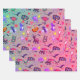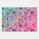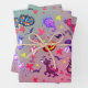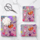 Lustige bunte Monster, Fledermäuse, Kürbisse mit Lächeln und Herbstblätter auf einem bunten Hintergrund.