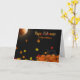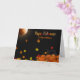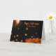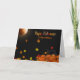 Schwarze Katze in Kürbis mit Vollmond und Herbstlaub auf schwarz.