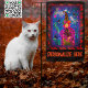 Eine zauberhafte Rotkopfhexe hält ihre schwarze Katze an einem mysteriösen Halloween-Abend, während drei schelhafte Krähen in den toten Bäumen herumkrachen, während zwei Geister und viele Fledermäuse im Himmel fliegen. Ein lustiges Familienprojekt zu Halloween oder einfach nur zum Spaß! Lebhafte, helle Farben.