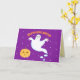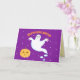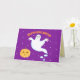 Halloween Grußkarte mit niedlichem Geist und Kürbis auf königlich lila Hintergrund. Texte können personalisiert sein.