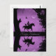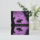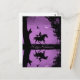 Frohe Halloween Postkarte mit einer Hexe und ihren Familien. Das ist ein magisches mystisches und skurriles glückliches Halloween. Eine Hexe, die auf einer sternenbedeckten Nacht ein Einhorn reitet, gerahmt von einem Eichenbaum mit einem Halbmond. Eine Katze fährt mit ihr, während sie einen Rabe hält, von dem einer vorbeifliegt, und eine Eule schaut sich einfach um. Ein Wasserteich reflektiert perfekt. Geschehen in der mystischen lila Farbe. Eine lustige mystische magische skurrile Art, glückliche Halloween-Wünsche zu schicken.