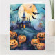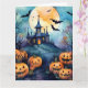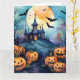Glückliche Halloween-Karte mit einer Aquarellmalerei eines Halloween-Abends mit spitzigen Jack-o'-Laternen, dem Mond, Fledermäusen und einem Spuk Herrenhaus vorne und einem Skelettgeister mit einer Jack-o'lantern innen. Personalisieren Sie diese lebendige Halloween-Karte einfach mit Ihrem Familiennamen und Text.