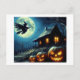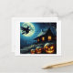 Eine Hexe fliegt auf einem Besenstiel über einen leuchtenden Vollmond und wirft ein unheimliches Glühen über ein unheimliches Haus und drei geschnitzte Kürbis. Der Rahmen ist mit Fledermäusen im Hintergrund und nackten Bäumen, die zum Nachthimmel aufgeschlitzt sind, vervollständigt.