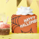 Dieses fantastische Papier zu Halloween hat Spinnennetze und Spinnen auf einem orangen Hintergrund. White Happy Halloween Text.