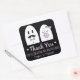 Vielen Dank für Ihre besonderen Gäste mit diesen schönen Halloween-Paaren Hochzeit, Paare oder Brautparty-Aufkleber, die sagen Dankeschön für die Feier mit mir und meinem Sohn. Ein niedlicher Geisterbräutigam trägt einen Schnurrbart und eine Bogen-Krawatte, während die Braut einen lila Bogen trägt und einen Lavendelsträuß an Blume auf den lila und schwarzen Dankeschön bevorzugen Sie Labels. Personalisieren Sie es mit seinem und ihrem Namen. Artwork © Chrissy H. Studios, LLC. Alle Rechte vorbehalten.