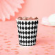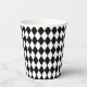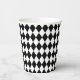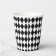 Der Papierbecher aus Halloween-Party wird mit einem harlequin-Diamantdruck gezeigt. Farbe Schwarz/Weiß Passen Sie dieses Objekt an oder kaufen Sie, wie es ist. Börsenbild vecteezy.com
