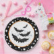 Die Papiertafel aus Halloween-Party wird in Schwarz-Weiß-Polodots-Design mit Fledermausdruck gezeigt. Passen Sie dieses Objekt an oder kaufen Sie, wie es ist. In 9" Größe angezeigt. Verkauft in Paket mit acht. Bild