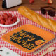Diese Papiertafel wird in einem festlichen Halloween-beängstigenden Kürbis-Druckdesign gezeigt. Passen Sie dieses Objekt an oder kaufen Sie, wie es ist. Bild