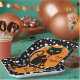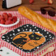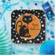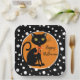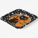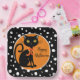 Die Papiertafel aus Halloween-Party wird in Schwarz-Weiß-Polka-Punkten mit schwarzem Katzenprint gezeigt. Passen Sie dieses Objekt an oder kaufen Sie, wie es ist. In 9" Größe angezeigt. Verkauft in Paket mit acht. Bild