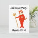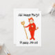 Ein Halloween-Party Einladung mit einem Kind in einem Kostüm des roten Teufels, aus einem Design handgemalt in Aquarellen von Judy Adamson. Der Text auf der Vorderseite sagt: "Halloween-Party! Bitte folgen Sie uns!' und der Rücken ist leer verlassen, um die Details des Party auszufüllen.