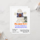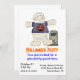 Farbenfrohe Einladung zum Halloween-Party. Niedliche Landgrafik einer Mumie, die einen Halloween-T - Shirt trägt und neben einem Grabstein stehend ist. Ein sicherer Schlag für Kinder. Personalisieren Sie den ganzen Text für Ihre kleinen Monster Halloween-Veranstaltung.