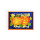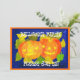 Ein buntes Halloween-Party Einladung mit zwei glühenden Kürbissen auf dunkelblauem Hintergrund aus einer handgemalten Papier Collage Design von Judy Adamson. Die Schrift, 'Halloween-Party! Bitte nehmen Sie an!' ist in weiß und die Rückseite der Karte wird leer verlassen, damit Sie die Einladungsdetails hinzufügen können.