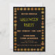 Halloween-Party Einladung mit Jack o' Laterne Rahmen mit einem dramatischen schwarzen Hintergrund. Auf der anderen Seite der Karte befindet sich ein schwarz-orangefarbenes kariertes Muster.