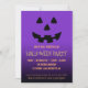 Halloween-Party-Einladung mit einem Kürbis Jack o' Laterne Gesicht auf einem dramatischen Gefälle lila und schwarz Hintergrund. Auf der anderen Seite der Karte befindet sich ein schwarz-orangefarbenes kariertes Muster.