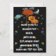 Halloween Einladung mit einem schwarzen Himmel, Crescent Mond, farbenfroher Saturn, Wolken und farbenfrohen Sternen. Niedliche Pumpkin-Familie stehend neben einem Baum mit orangefarbenen Blätter und einem Big BOO! Mit Augen auf den Briefen laden Sie alle zu einem höchst, aber nicht zu spöttischen Halloween-Party ein. Ideal auch für das Kirchenernte Halloween-Party!