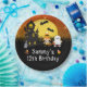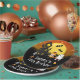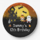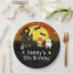Dieser lustige und spukhafte Teller besticht durch eine niedliche Hexe und einen Geist neben einem gekreuzten Spuk Haus. Im Hintergrund ist ein Vollmond mit Fledermäusen und ein orangefarbener Nachthimmel mit Sternen. Das ist perfekt für eine Geburtstagsfeier zu Halloween-Themen.