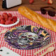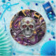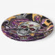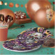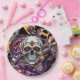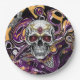 Día de Muertos oder Halloween-Party Papier Teller in schwarz, lila, gold mit einem Zuckerschädel.