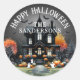 Geben Sie den Gästen jedes Jahr bei einem Halloween-Kostüm-Party oder bei einem lustigen und einfachen Aufkleber ein paar schöne Gastgeschenke. Die Einrichtung besteht aus einem Spuk Haus in Schwarz/Weiß mit orangefarbenen Akzenten aus einem Baum, Kürbissen und Jack-o'-Laternen, die mit Geist- und Fledermausdetails zu einem besonderen Halloween-Charme verströmen. Die Typografie verfügt über einen eleganten Vintagen Grunge Serif-Schriftart, der dem Design ein altes, leicht unheimliches Ambiente verleiht - perfekt für eine Spuk Halloween-Ästhetik. Sie können diesen Aufkleber auch als Umschlag Aufkleber verwenden, um Ihrem Party eine unheilvolle Touch hinzuzufügen. Spaß Niedliche Spooky Spuk House Ghost Bats Orange Black Happy Halloween Party Classic Round Sticker.