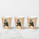 Halloween-Papiertassen mit gotischer und Vintager Ästhetik. Mit einer sprichwörtlichen Skelettgrafik auf einem Hintergrund für gealterte Papiereffekte.