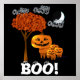 Niedliche Kürbisfamilie stehend von einem Baum mit Orangen Herbst hinterlässt Posterdekorationen für Halloween- oder Erntezeit-Party. Perfekt für das Kirchenernte Halloween-Party. Weißer Mond und Wolken mit einer freundlich lächelnden Halloween Pumpkin Head Familie mit einem freundlichen BOO! Mit sonnigen Augen auf jedem großen Buchstaben!