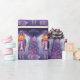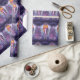 Ein bezaubernder orangefarbener Jack-o'-Laterne-Nusscracker, der ein fallendes Ahornblatt hält, erscheint im Licht eines Halloween Vollmonds, umgeben von funkelnden lila Kiefernbäumen und glitzernden Lavendel-Kürbissen. Original Illustration von Noël Snow.