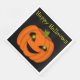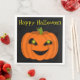 Orangefarbener Kürbis mit einem lächelnden Gesicht und gelb leuchtenden Augen. Vorlage über dem Lesen "Happy Halloween". Schwarzer Hintergrund.