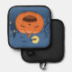 Adorable lachende Halloweenkürbis. Ein toter Baum, ein gruseliges Herrenhaus, ein paar Fledermäuse und der Mond sind im Hintergrund zu sehen.