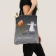 Eine niedliche Halloween-Tasche mit einem Kürbis und Gespenst, die das Kostüm-Party begonnen und tanzt.