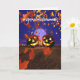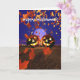 Grußkarte mit meinem Original-Kunstwerk von zwei lachenden Kürbissen zu Halloween-Nacht mit Vollmond und Herbstlauben. "Happy Halloween" auf der Vorderseite und mein individualisierbarer Vers drinnen.