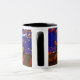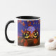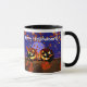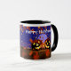 Kaffee-Tasse mit meinem original digitalen Kunstwerk von zwei lebhaften Kürbissen zu Halloween-Abend mit Vollmond dahinter und fliegenden Herbstlauben. Im Text steht: "Happy Halloween!"