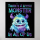 Niedliches und albernes lila, blaues, furioses Halloween-Monster mit dem Zitat, es gibt ein kleines Monster in uns allen".