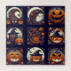 Diese lebhafte und farbenfrohe Illustration zeigt eine Sammlung von Halloween-Designs, die sich um Kürbisse drehen. Es gibt Kürbisse mit sprichwörtlichen Gesichtern, Kürbisse mit Hexenhüten und Kürbisse, umgeben von Fledermäusen und Sternen. Weitere Elemente sind Geister, Schädel und wirbelnde Muster. Die Stimmung des Bildes ist festlich, spukhaft und etwas unheimlich, perfekt für Halloween-Feiern.