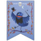 Ein preußisch-blauer Federschwarz ist formell in einer satinierten Weste, orangefarbener Bugs-Krawatte, Tophut und Stock gekleidet, während er auf einem Baumarm unter dem weißen Halbmond tanzt.