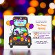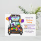 Trunk oder Leckerei Party! Feiern Sie Ihr kurioses Halloween und laden Sie Freunde und Familie zu Ihrem alljährlichen Event ein mit diesem lustigen, niedlichen Handgezeichneten Wagen mit dem Kofferraum voller Halloween-Goodies, Gespenst, Süßigkeiten, Ballons, Fledermäuse, Spinnen, Kürbis in Orange, lila.