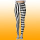 Gemusterte, schwarz-weiß gespaltene Leggings mit Streifen auf einem Bein und Harlequin-Diamanten auf dem anderen