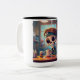Skelett genießt Kürbiskaffee bei seiner Lieblings-Halbblutkaffee-Tasse.