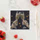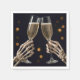 Zwei Champagnergläser, gefüllt mit Brauseglasbläschen, werden von Skeletthand vor einem Hintergrund sanft leuchtender Party gehalten
