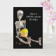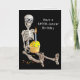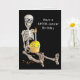 Skelett, das einen Kuchen mit beleuchteter Kerze und bunten Sprinklen zum Halloween-Geburtstag hält