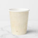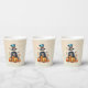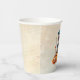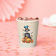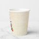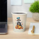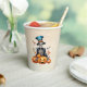 Halloween Skeleton Paper Cup. Farbenfrohe Halloween-Papiertasse mit grinsender Papiertasse. Skelett trägt einen Tophut und sitzt auf Kürbissen.