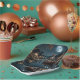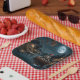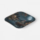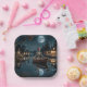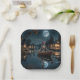 Ein Skelett mit einer roten Baseballkappe sitzt in einem kleinen Boot auf einem ruhigen, mondbeleuchteten Kanal, mit gemütlichen Kabinen am Ufer