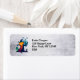 Adressetiketten mit einer coolen Zwischendarstellung. Set auf grauem Grunge Hintergrund. Eine große Kürbisschreie mit einem Kürbiskopf, die einen Hexenhut trägt. Er hat ein bedrohliches Grinsen mit zertäterten Roben und ist in einem Friedhof stehend, wo eine Krähe auf seinem Arm schreit. In der Ferne fliegen Fledermäuse ab, ein Vollmond im Hintergrund und eine einsame Eule mit leuchtenden Augen sitzen auf einem Grabstein.