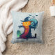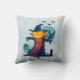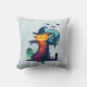 Ein Kissen mit einer coolen Zwischendarstellung. Set auf grauem Grunge Hintergrund. Eine große Kürbisschreie mit einem Kürbiskopf, die einen Hexenhut trägt. Er hat ein bedrohliches Grinsen mit zertäterten Roben und ist in einem Friedhof stehend, wo eine Krähe auf seinem Arm schreit. In der Ferne fliegen Fledermäuse ab, ein Vollmond im Hintergrund und eine einsame Eule mit leuchtenden Augen sitzen auf einem Grabstein.