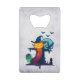 Ein Flaschenöffner im Kreditkartenstil mit einer coolen Zwischenansicht. Set auf grauem Grunge Hintergrund. Eine große Kürbisschreie mit einem Kürbiskopf, die einen Hexenhut trägt. Er hat ein bedrohliches Grinsen mit zertäterten Roben und ist in einem Friedhof stehend, wo eine Krähe auf seinem Arm schreit. In der Ferne fliegen Fledermäuse ab, ein Vollmond im Hintergrund und eine einsame Eule mit leuchtenden Augen sitzen auf einem Grabstein.