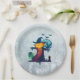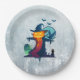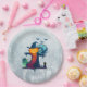 Papier Teller mit einer coolen Halbblenddarstellung. Set auf grauem Grunge Hintergrund. Eine große Kürbisschreie mit einem Kürbiskopf, die einen Hexenhut trägt. Er hat ein bedrohliches Grinsen mit zertäterten Roben und ist in einem Friedhof stehend, wo eine Krähe auf seinem Arm schreit. In der Ferne fliegen Fledermäuse ab, ein Vollmond im Hintergrund und eine einsame Eule mit leuchtenden Augen sitzen auf einem Grabstein.