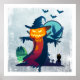 Ein Plakat mit einer coolen Halbmalerei. Set auf grauem Grunge Hintergrund. Eine große Kürbisschreie mit einem Kürbiskopf, die einen Hexenhut trägt. Er hat ein bedrohliches Grinsen mit zertäterten Roben und ist in einem Friedhof stehend, wo eine Krähe auf seinem Arm schreit. In der Ferne fliegen Fledermäuse ab, ein Vollmond im Hintergrund und eine einsame Eule mit leuchtenden Augen sitzen auf einem Grabstein.